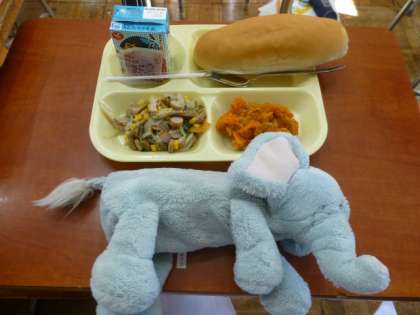 秋野菜のラタトゥイユにウインナーとコーンのソテーです。主食はコッペパンにいちごジャムでした。昼休みに2年生の女子生徒に感想を聞くと、ラタトゥイユが甘くて美味しかったですと答えてくれました。