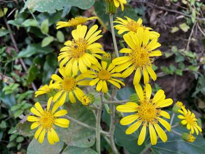 校舎裏の桜の根元に、石蕗(ツワブキ)の黄色い花が咲いています。葉は蕗(ふき)に似ていて、名前は”つや”のある葉から”つやぶき”。それが変化して「つわぶき」になったとの説があります。