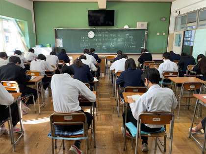 2校時、南校舎3Fの2年生の教室で、英語のテストが行われています。このテストで5教科すべてのテストが終了します。生徒の皆さん、ご苦労様でした。
