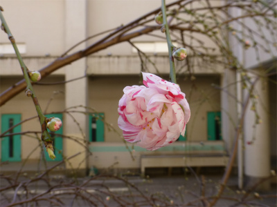 北校舎の1・2年生の昇降口前の植え込みにある花桃がたくさんつぼみを付けています。一本の木に紅白の花が咲く珍しい源平桃で、江戸時代に品種改良をされたものだそうです。