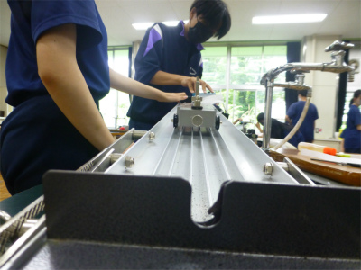 3校時、北校舎2Fの理科室で、3年生が運動の実験を行っていました。斜面上を下る台車の運動と台車にはたらく力との関係を記録タイマーを使って調べています。