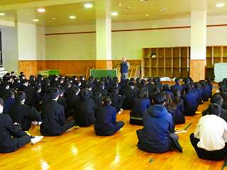 22日(金)の2校時、柔剣道場にて3年生学年集会が行われました。集会の中で拠点校指導員の三木先生が抜刀道を披露されました。まず「五徳」のお話がありました。「仁・義・礼・智・信」武道の心得からは学ぶものが多くあります。本物の刀をはじめて見た人も多かったのでは…。緊張感の中にも学年の優しさが十分に広がった集会となりました。