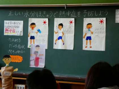 1校時、教育実習の先生が5組にて「正しい水分補給で熱中症を予防しよう」を題材として研究授業を行いました。ペットボトルに色の違った水を準備し3体の人形も登場して、とても分かりやすい内容でした。生徒の発表の数々に「主体的・対話的な授業展開」が見てとれました。
