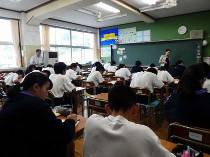 21日(金)2校時、1年生で家庭科の研究授業が行われました。「衣類についた汚れを落とす」が題材でした。授業クラスの学級目標は「Keep Smile!」いつも笑顔でという意味でしょうか。授業者の担任は常に生徒に微笑みかけ、それに元気な笑顔で答える生徒たち。すべての汚れは笑顔が最高の洗剤となってきれいにしてくれるようです。
