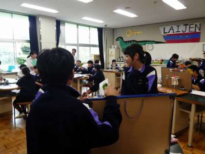 27日(木)、4校時1年生が理科の研究授業に臨みました。「みかんは、根、茎、葉、花のどの部分を食べているのでしょうか?」「種があるから花かな…」。途中には実物のごぼう、玉葱、ブロッコリ…も登場し、班別の対話も十分に深まりました。実際の食生活に直結するとても興味深い授業で、今夜の食卓の話題となることは必須と思われます。