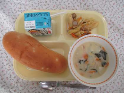 コーンクリームシチューにきのこのペンネソテーです。主食は玄米パンでした。1年生の男子生徒は、シチューもきのこも美味しかったですと言っていました。