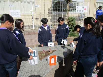 第1理科室でピンホールカメラの使い方の講義を受け、暗室の多目的室で印画紙をセットして、グラウンドで撮影しました。