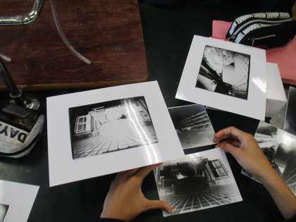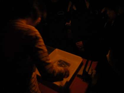 ピンホールカメラで撮影後、多目的室の暗室の中で印画紙を現像します。