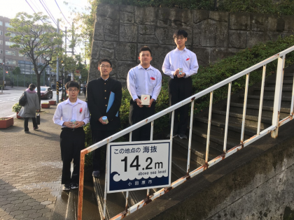 登校時に階段下で、生徒会総務部の生徒達が赤い羽根共同募金への協力のお願いをしています。