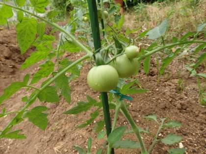 先月植えたトマトの実が大きく育ってきています。その重さに耐えられなくなったトマトの幹を支柱で支える作業を行いました。