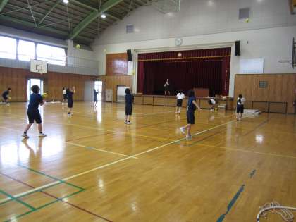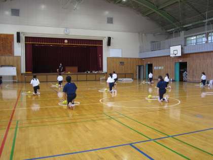 1年生の体育の授業のようすです。人との間隔を保ちながら、ストレッチやボールを使った運動を行っていました。