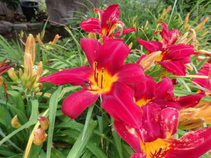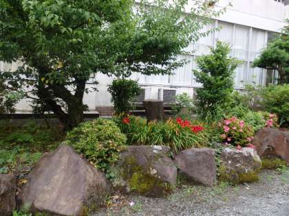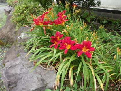 中庭の植え込みに橙赤色のワスレグサの花が咲いています。ワスレグサ(忘れ草)は花が一日限りで終わると考えられたために付けられました。いくつかの種類があるようですが、これはノカンゾウと呼ばれる種類のようです。