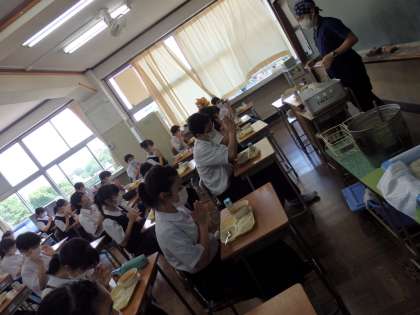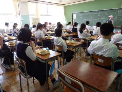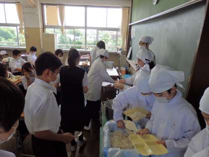 中学校へ入学して、初めての給食です。配膳が終わってから全員でいただきますをします。コロナ対策のために、先生も三角巾、マスク、エプロンで配膳を手伝います。