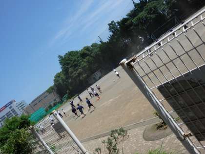 南館2Fの廊下では、3年生が楽しそうに会話しています。グラウンドでは男子生徒が元気よくボールを追いかけています。気温は26度を指していました。