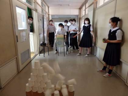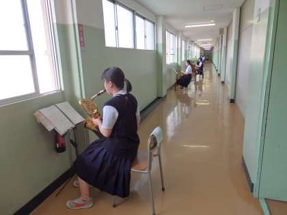 廊下では吹奏楽部がソーシャルディスタンスを取って練習しています。美術室では美術部が活動し、理科室前の廊下では科学部が空気砲の試射を行っていました。