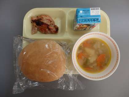 照り焼きハンバーガーにベーコンとポテトのスープでした。昼休みに体育館の入口にいた2年生の男子生徒たちに感想を聞くと、牛乳が冷たくて美味しかったです、久しぶりに色とりどりで色がたくさんありました、スープは美味しかったけど、飲んでいるときに目に入って痛かったですと答えてくれました。また、給食への要望を聞くと、飲み物の種類を増やしてほしい、お茶がいいです、塩焼きのサケを増やしてほしいと言っていました。