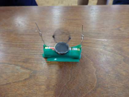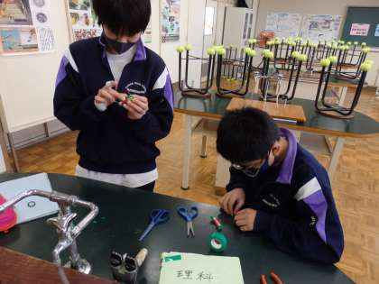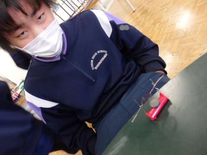 2校時、北館2Fの第1理科室で、5組の生徒がモーター作りに挑戦しました。コイルがうまく回ったのは5人中1人だけでした。クリップで作った端子の接触不良が回らない原因と思われます。