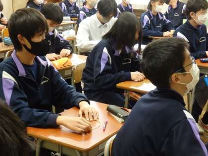 6校時、1・2年生の教室では、生徒会が提案したシトラスリボンの取り組みについて学ぶ学級会活動を行いました。「シトラスリボン」のそれぞれの輪は、「地域」「家庭」「職場(または学校)」を表現しています。