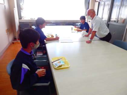 給食の時間、立候補者と選挙管理員が南館1Fの会議室で給食を食べてから、職員室の放送設備を使って意見放送を行ないました。1年生の教室では各立候補者の意見を給食を食べながら聞いています。放送を終えた立候補者の一人は、緊張して早口になってしまいました、立会演説会当日は今日の経験を生かして頑張ります、と言っていました。