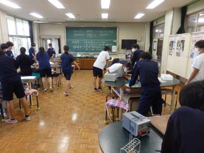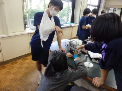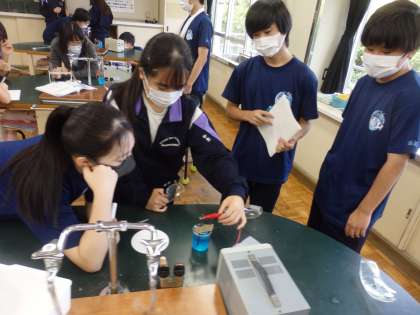 1校時、北館2Fの第1理科室で、3年生が理科の実験を行なっています。塩化銅水溶液に電気を流して変化するようすを調べました。ビーカー内の電極の小さな変化を注意深く観察しています。