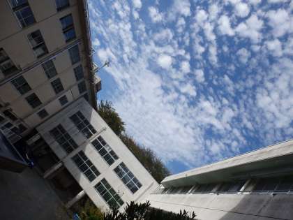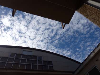 午前中に校舎の窓から空を見上げると、晴れ渡って高く見える青空にうろこ雲やひつじ雲が見えていました。