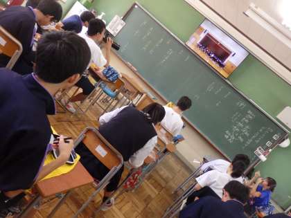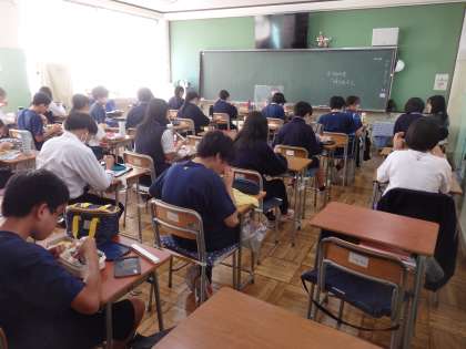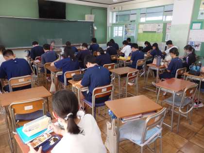 昼食の時間、南館2Fの教室で、3年生が午後の授業に備えてお弁当を食べています。クラスによっては、黒板上の大型テレビに自分たちの歌ったようすを映したり、CDラジカセで曲を流したりしながら、合唱の練習時間の不足を補っていました。