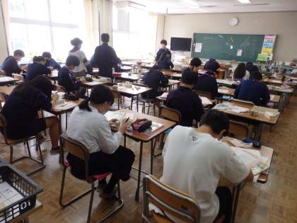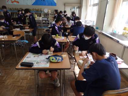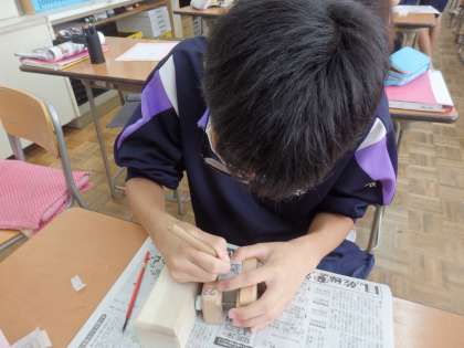 2校時、北館2Fの美術室で、3年生が美術の授業を行なっていました。篆刻のデザインを見ながら石を削っていきます。