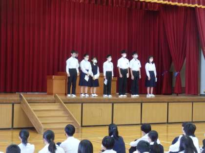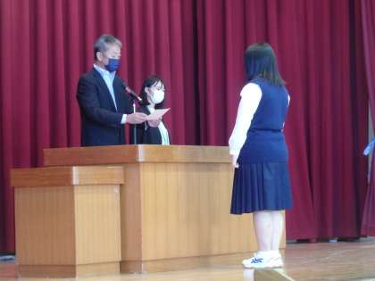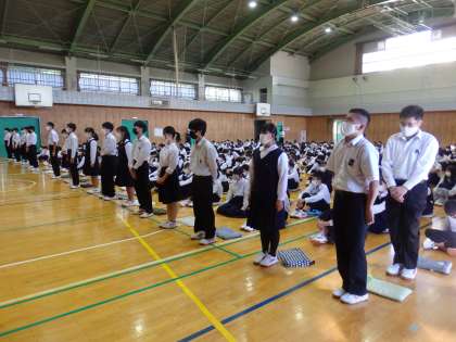 1校時、体育館2Fアリーナで、全校生徒が集まり後期生徒会役員の認証式、学年・各種委員会の委嘱式が行なわれました。担当の先生が呼名すると、生徒はその場で大きな声で返事をして起立します。