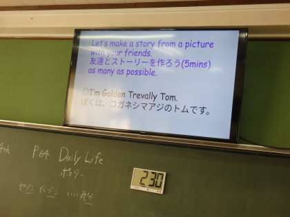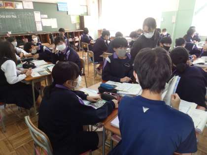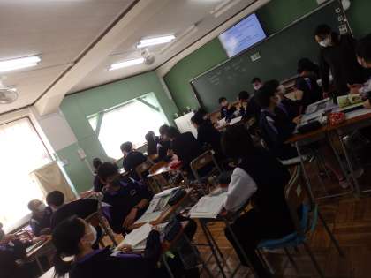 3校時、南館2Fの教室では、3年生の英語の授業が行なわれていました。11月になり授業の始まりに歌う英語の音楽が変わっています。