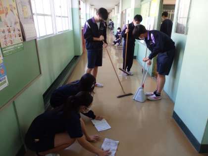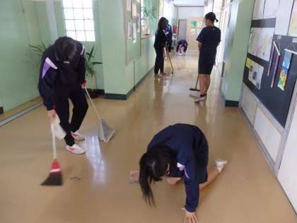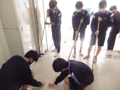 給食終了後、10分間の清掃時間が始まります。南館2Fでは3年生が熱心に床の掃除をしていました。
