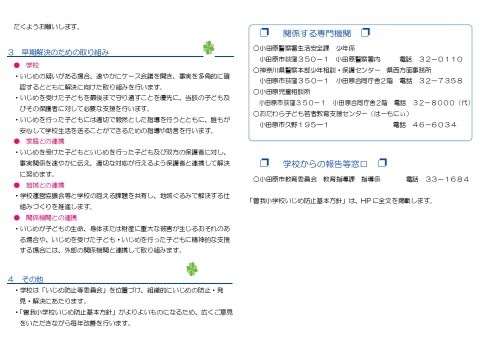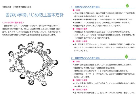 曽我小学校では、いじめ防止に向けての基本方針をリーフレットにまとめ、保護者に配付しています。
