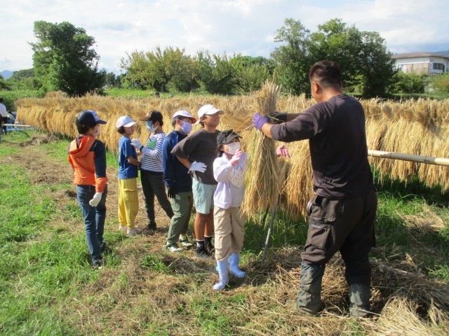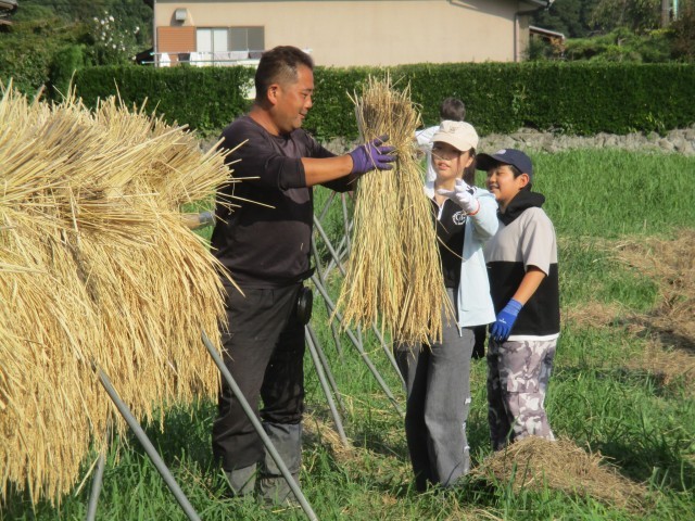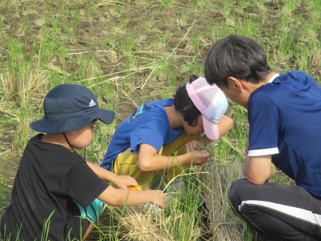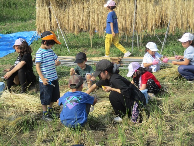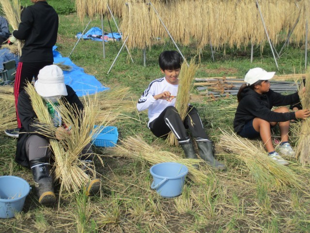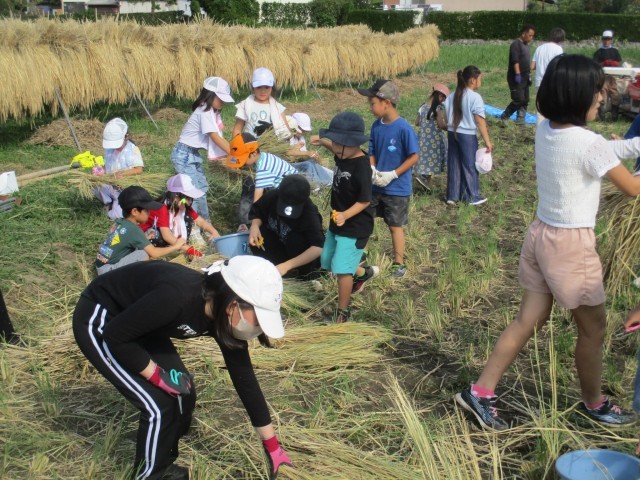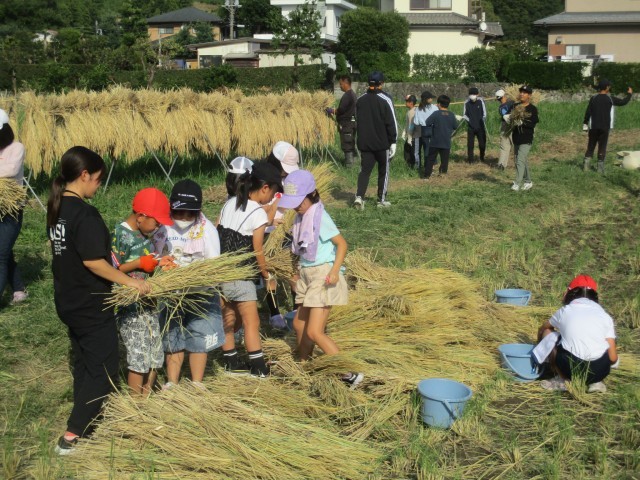 5年生→4年生→6年生の順に、交代しながら稲束を脱穀機まで運ぶ作業を行いました。1~3年生も落穂ひろいをしながら、稲穂に残ったお米をハサミで切って集めてくれました。