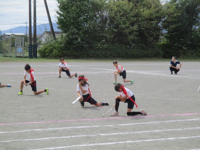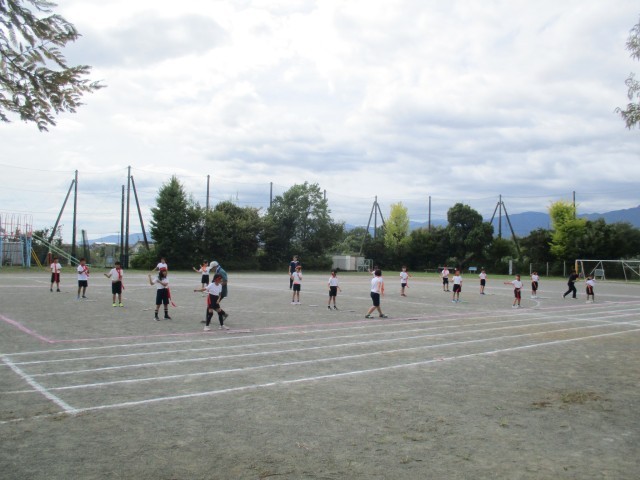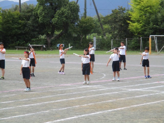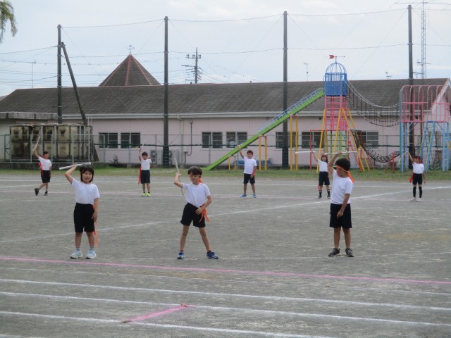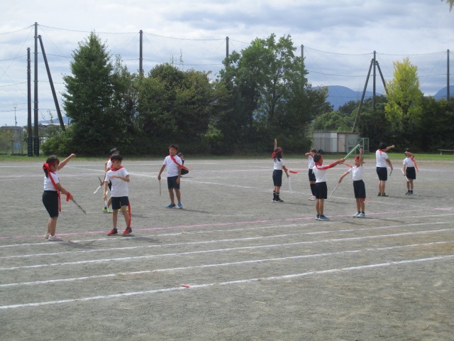 台風22号の影響で少し風が強かったのですが、運動会にむけて中学年(3,・4年生)が、校庭で表現種目の練習をしていました。