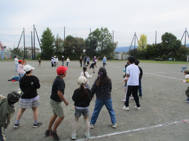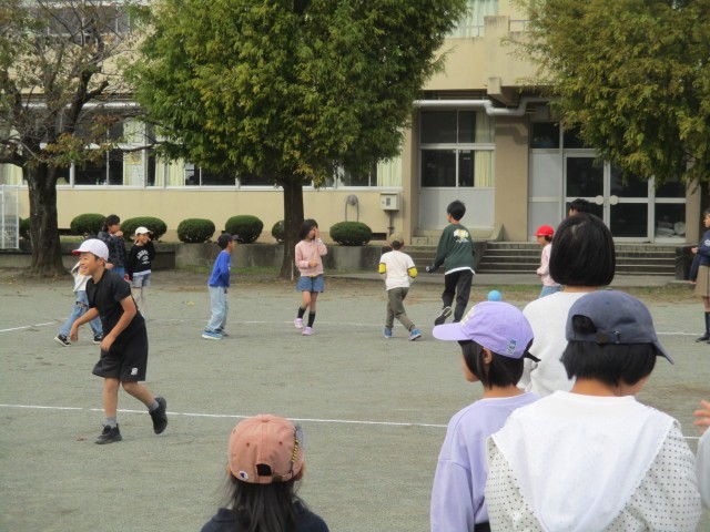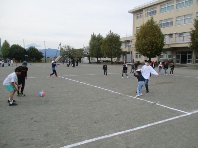 1年生から6年生までが混合の4つの班に分かれているのですが、今日は2班ずつに分かれて、運動場でドッジボールをしました。