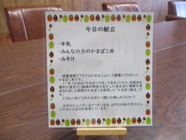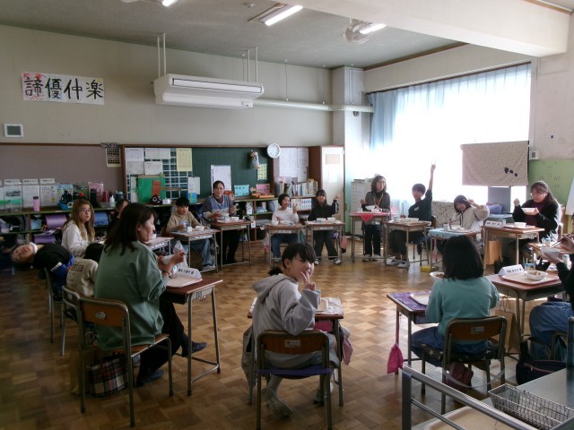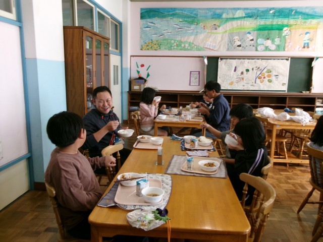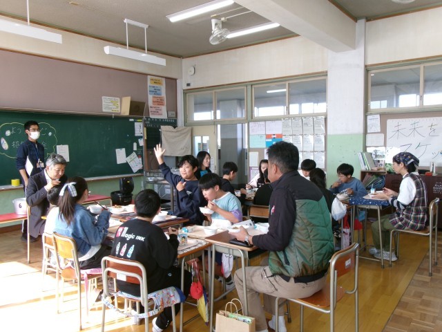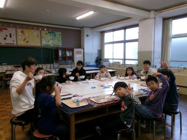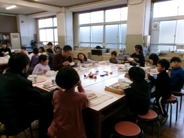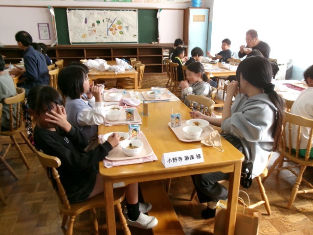 4校時の『稲作体験学習報告会』のあと、お手伝いいただいたボランティアの方々をお招きして、どろんこ田で獲れた新米を食べる『招待給食』を行いました。