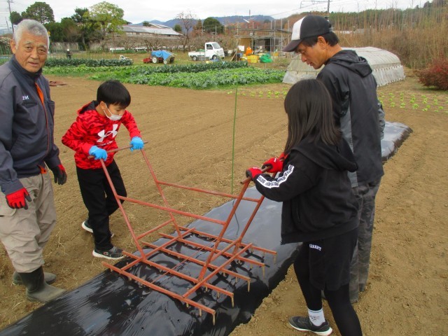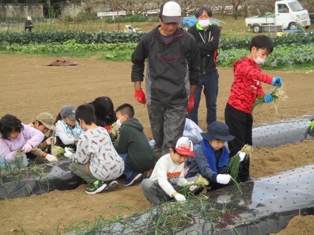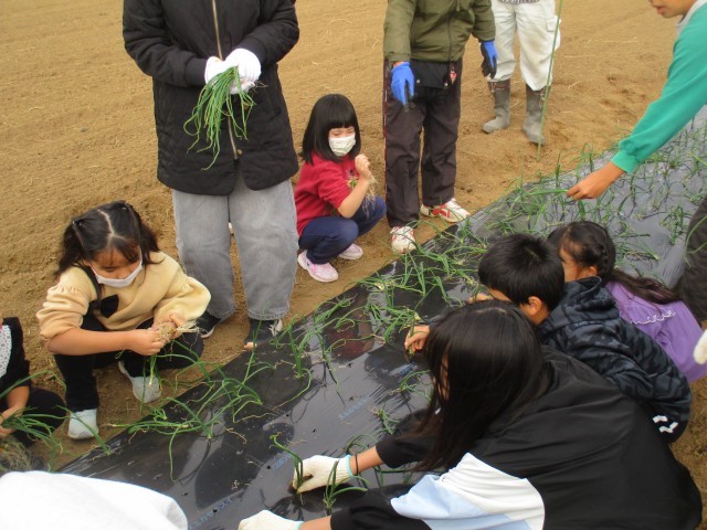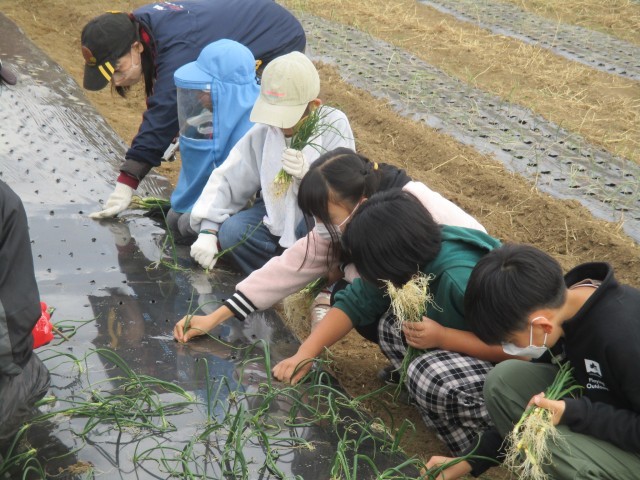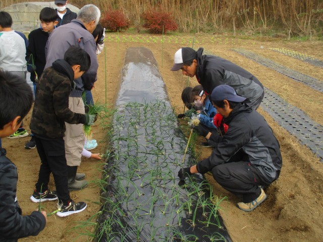 今年度も、JAかながわ西湘・青壮年部の方々とNPO法人 小田原食とみどりの方々にご指導・お手伝いいただきながら、たまねぎの苗の植え付けを行いました。