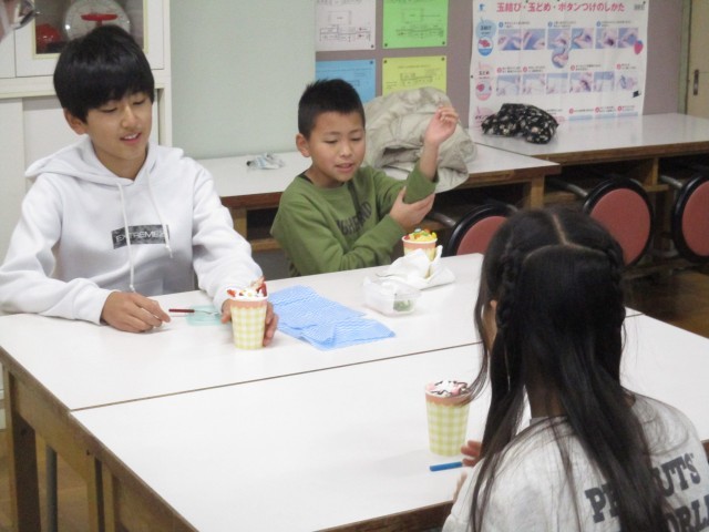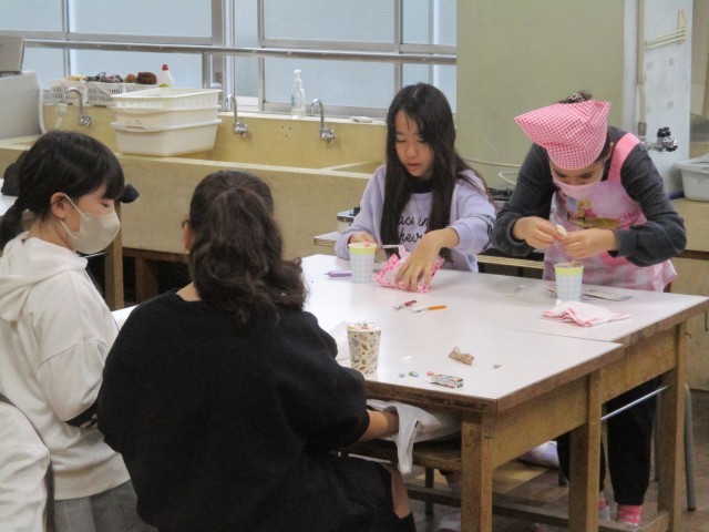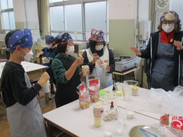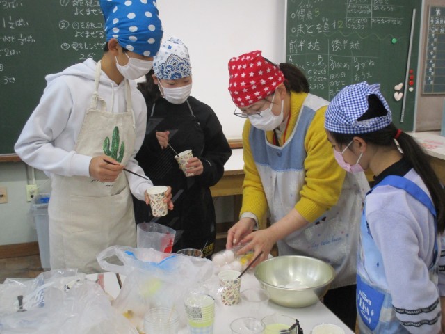 校内を回っていると家庭科室からいい匂いがしてきたので、そっと覗いてみてみると、5年生が楽しそうにカップケーキを作っていました。