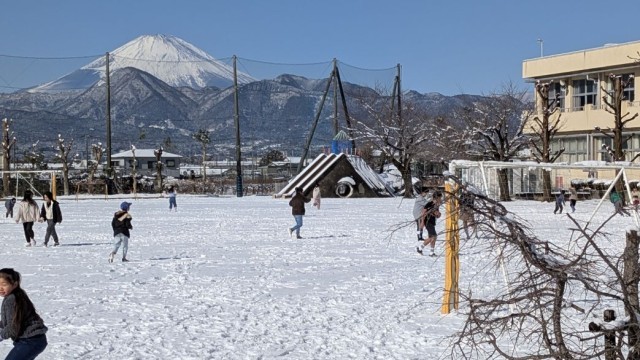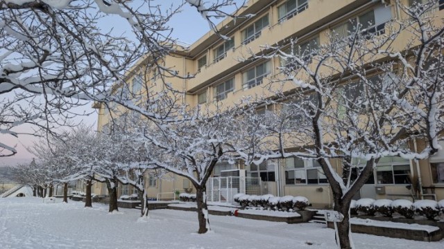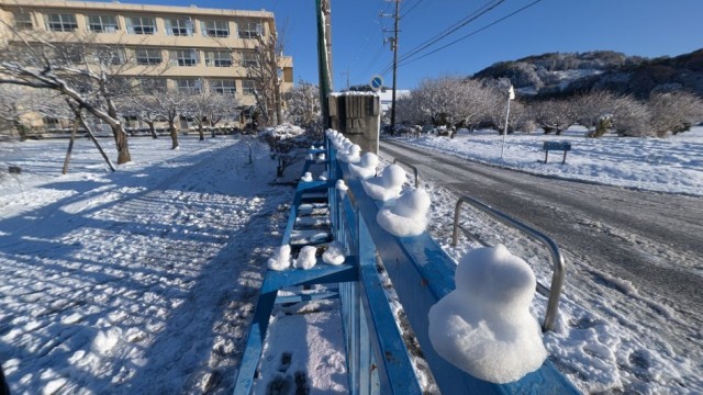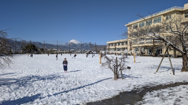登校時間を2時間遅らせて、3校時から始めることにした学校ですが、子どもたちは学校に到着するなり、雪あそびを始めました。