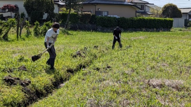 雑草に覆われた「どろんこ田」で、今年も「おやじの会」のみなさまにご協力いただいて「水路切り」を行いました。 この作業をすると「今年も稲作活動が始まる!」「どんな楽しい学びになるのかな。」と、わくわくしてきます。