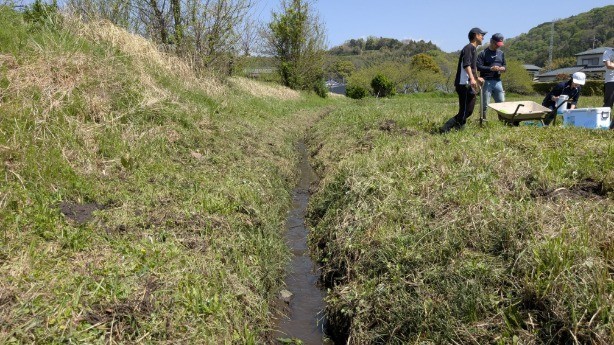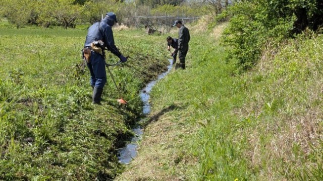 土が崩れて浅くなってしまった水路の土砂をスコップでさらったり、雑草を草刈り機で刈ったりと、かなりの重労働でしたが、わずか2時間程度で、あっという間にきれいに水が流れるようになりました。