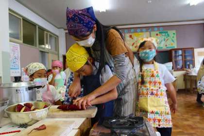 いもを自分で切ったり、材料を混ぜたりすることは初めての子も多く、とても緊張した様子でしたが、スクボラのお母さんたちに助けられながら、一生懸命がんばりました。