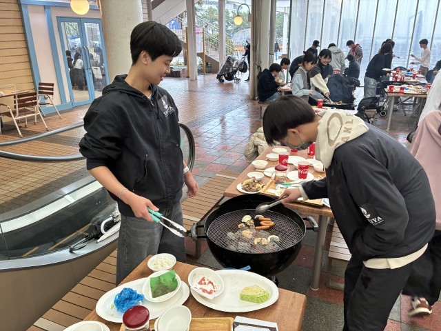お昼のBBQの様子です。みんなで楽しく食べています。