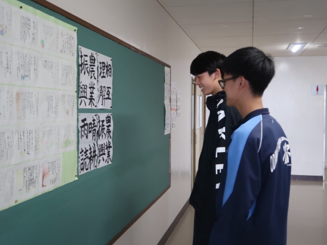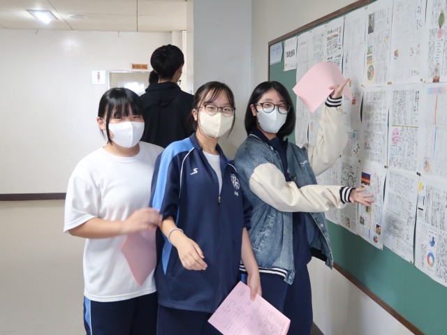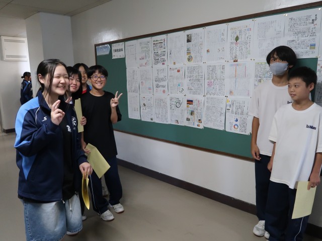 明日の学習発表会に向けて、合唱や各団体の発表の練習も大詰めを迎えています。最後の合唱練習のあと、展示物の見学を行いました。国語・社会・家庭科・美術の教科の展示物や、3組、遠足・修学旅行の成果物、保健委員会、美術部の作品が展示されています。明日の午前や10月20日(月)~31日(金)の学校公開週間の機会にぜひご覧ください。
