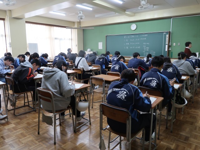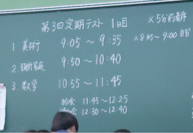 本日から、3年生は第3回定期テストが始まりました。1日目は、1時間目:美術、2時間目:技術と家庭、3時間目:数学のテストが行われました。テストは7日(金)まで続きます。今までの努力の成果が出るように頑張ってください。