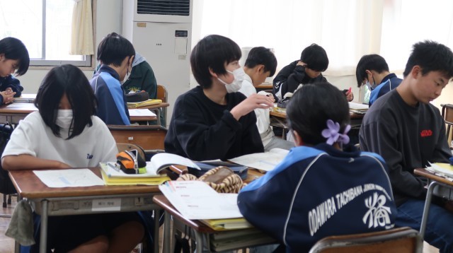 1年生保健体育 保健分野の研究授業。体の発育・発達についての内容です。「赤ちゃんは何cmで生まれてくる?」という先生の最初の問いかけから意見が活発に飛び交う雰囲気です。身長以外の成長について、発育・発達曲線からそれぞれの成長時期を考える場面では、グループ内で納得のいく答えを出すのに一人ひとりが理由を大切にしながら考えを伝え合いました。いっぱい頭を使って答えを探し、最後まで議論の続く楽しい授業でした。