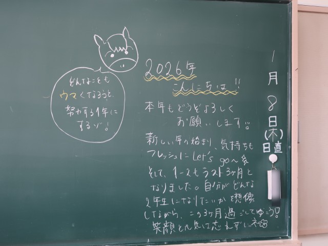 2026年の幕開け。学校には元気な生徒たちの笑顔が戻ってきました。1校時に全校集会と各クラス学活を行い、今年頑張りたいことやその具体を各自で決め、新たな始まりとしました。