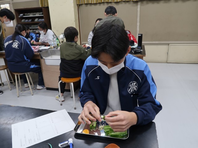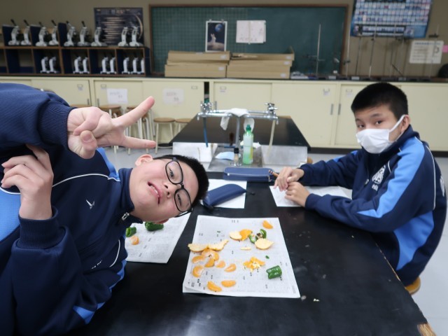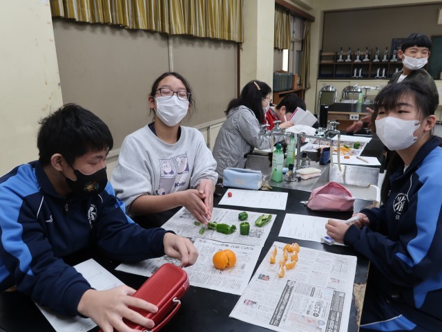 2校時、3組は理科の授業です。今日は野菜や果物に「いくつ部屋があるか」をテーマに、ピーマンやミカンを分解して、細かく観察しました。輪切りにしてみるとピーマンは縦に3つに部屋が分かれていて中央には「たね」があることがよくわかります。たねの数を一つひとつ数えている生徒もいました。お料理をする時とは違う視点での観察。新たな発見がいっぱいです。