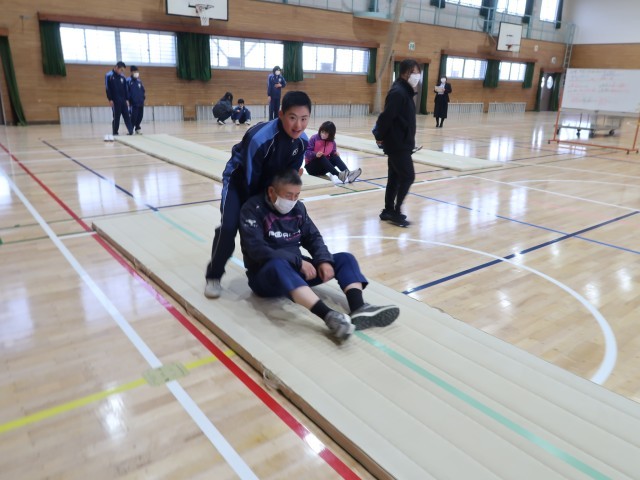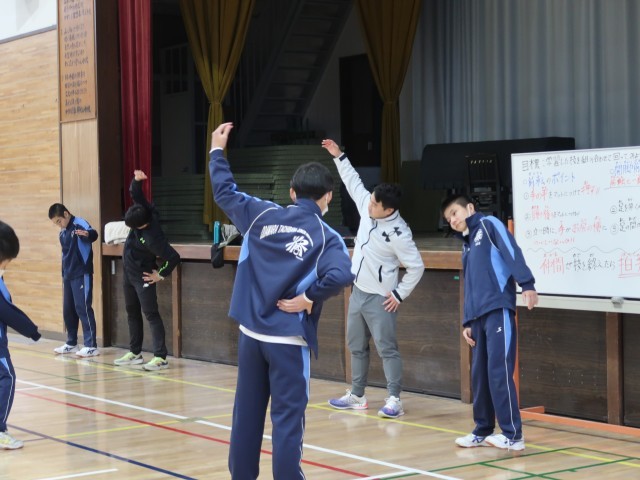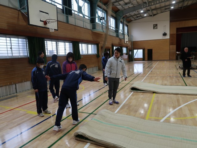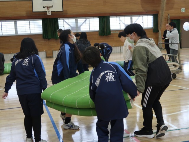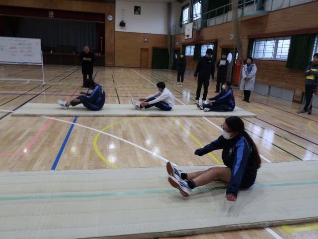 2校時に3組保健体育の研究授業がありました。器械運動のマット運動です。前転、開脚前転、バランス技を組み合わせた一連の動きを目指しました。たくさんの先生が授業を参観する中、生徒たちは意欲的に技の習得に励んでいました。できるようになると楽しいですね。とても前向きな生徒達でした。