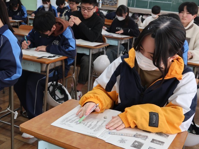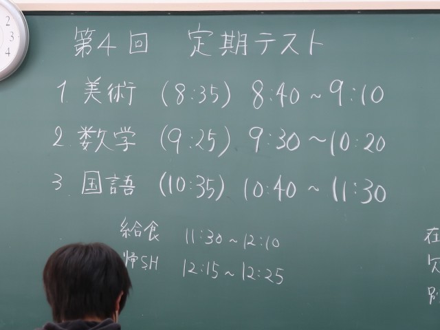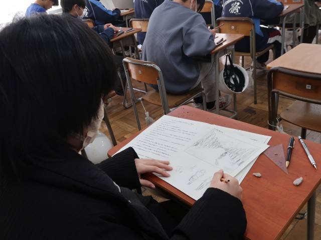 1・2年生は今年度最後の定期テストです。1時間目の美術では、時間いっぱいまで実技問題に取り組んでいました。
