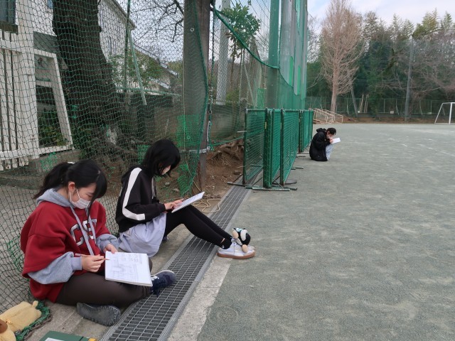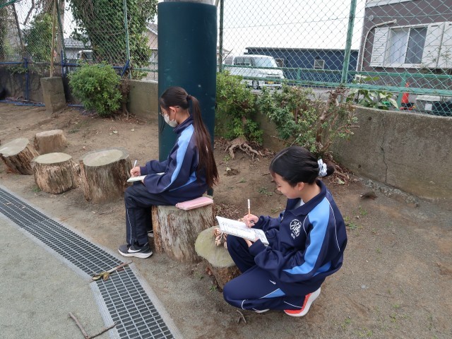 昨日で給食が終了し、今日からは午前日課が続きます。1年生の美術は野外スケッチをしました。校舎などの風景をじっくり描く生徒 や 飛んできたテントウムシを大きく描く生徒 と 題材はさまざま。いつもと違う屋外での作業にゆったりとした時間が流れます。